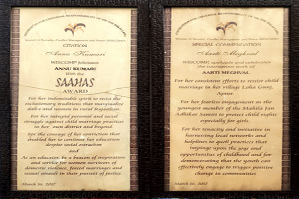 Two incredible young activists from MJAS were honored for their bravery: Annu Kumari, who courageously annulled her child marriage and advocated for the education of Dalit Girls Aarti Meghwal, a 16 year old girl who fought against her own child marriage and emerged as a leader in her village