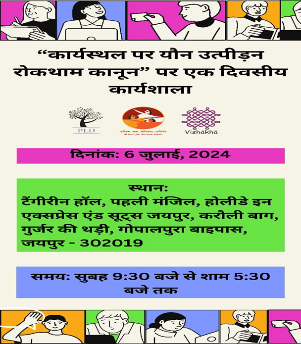 A one-day state level training workshop for the members of POSH commite on the “Prevention of Sexual Harassment at the Workplace” was organised in July 2024, by PLD, MJAS and Vishakha.