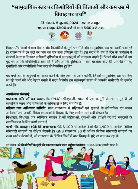 The two-day state level discussion on “Adolescent Concerns and Early Marriage at the Community Level” was successfully held in Jaipur on 4-5 July 2024. Jointly organized by Partners for Law in Development (PLD), Mahila Jan Adhikar Samiti (MJAS), Vishakha, and Girls Not Brides (GNB) Rajasthan and supported by the National Coalition Against Adolescent Concerns (NCAAC).